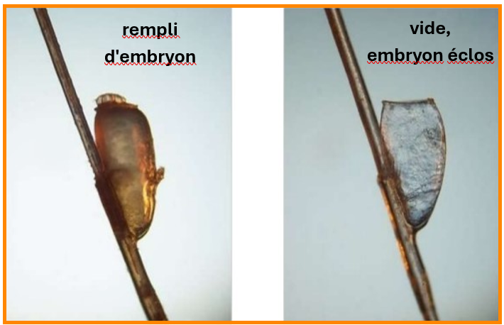 Les lentes blanches sont donc des œufs vides et les lentes brunes sont des œufs contenant un embryon (potentiellement vivant).